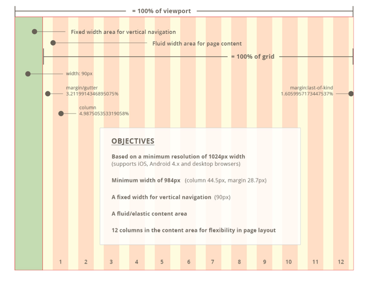 - A 12-column fluid-width content grid is placed next to the page's 1-column fixed-width left navigation