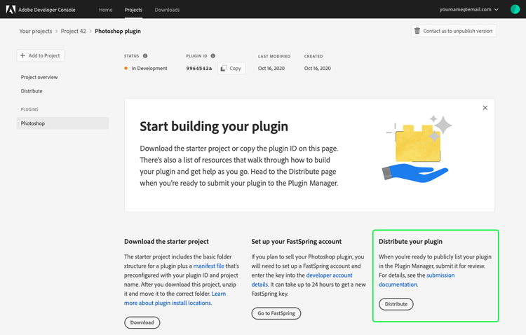 At any time you can return to the overview for the project by selecting Project overview in the left navigation. The overview includes information about the plugin project, including Products & services which lists the plugin that you created (in this example, an Adobe XD plugin). While you continue to work on your plugin it will appear as "In Development".