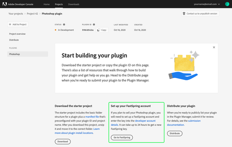 If you plan to sell your Photoshop plugin, you will need to set up a FastSpring account and enter the key into your public profile. For more information, please read the public profile overview.