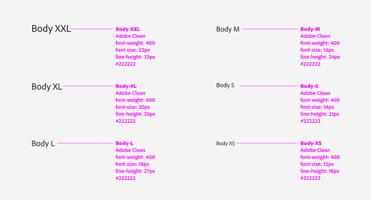 The available sizes for body text in Spectrum for Adobe Express span from XS to XXL, while the weight is usually around 400-500.