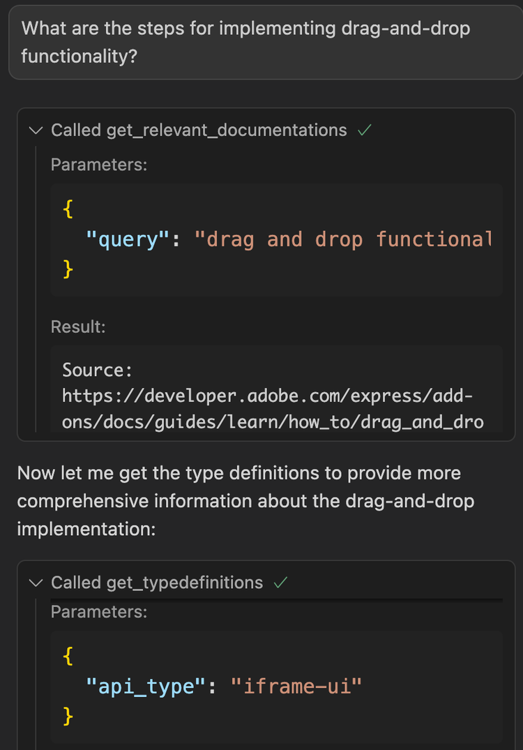 The LLM will automatically invoke tools based on your prompts. Here is an example of Cursor making calls to the Adobe Express Developer MCP Server tools to retrieve the developer documentation and type definitions based on the query. The expanded tool calls reveal the results of either the documentation source that matched the query, or the typescript definitions for the specific API in the parameters.