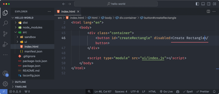 While your add-on is still loaded and running, open the src/index.html file and update the "Create Rectangle" string in the <button> below.